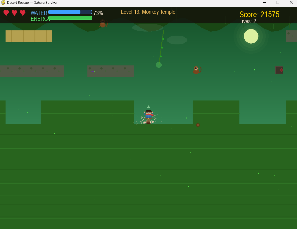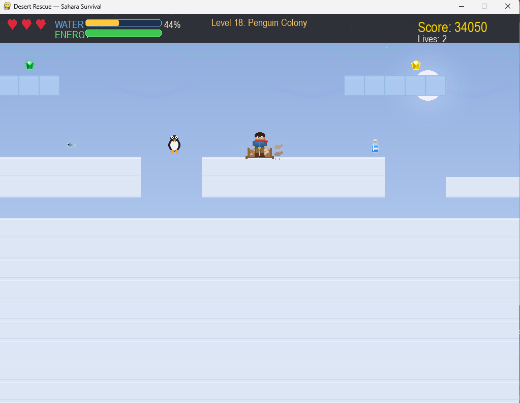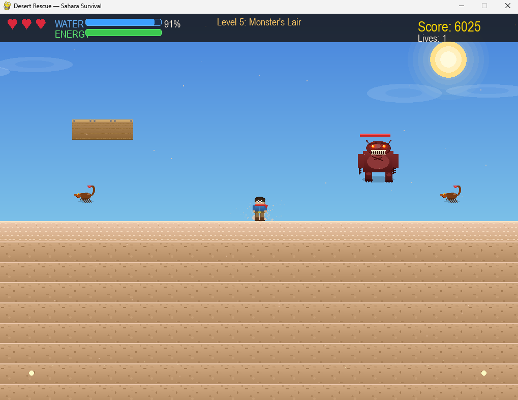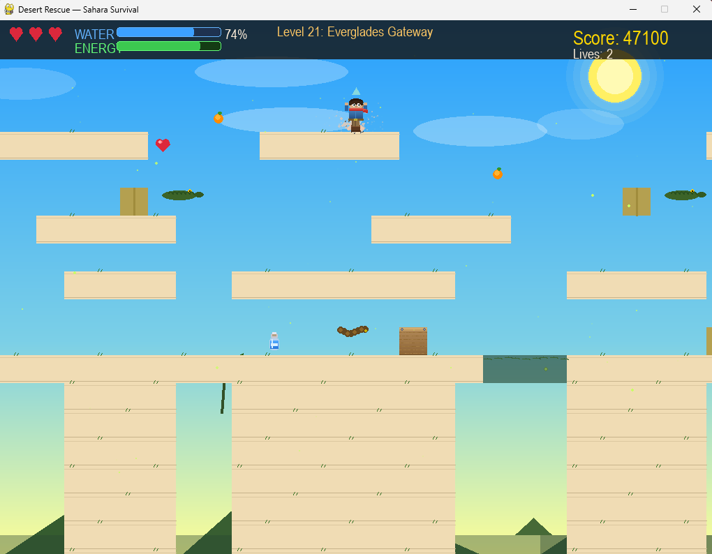 **Desert Rescue** is a retro-inspired 2D side-scrolling platformer built with Python and Pygame. Embark on an epic journey across **7 unique episodes**, each with distinct environments, enemies, and bosses.